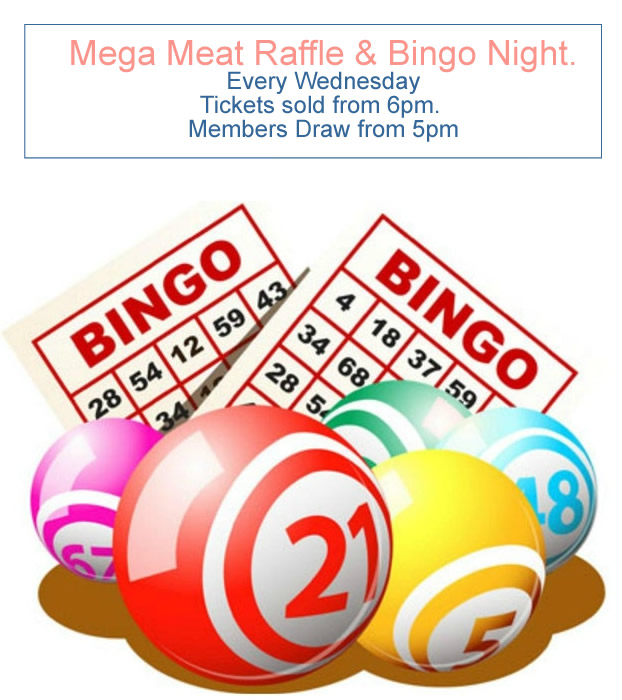 Mega Meat Raffle & Bingo Night. Tickets sold from 6pm. Members Draw from 5pm